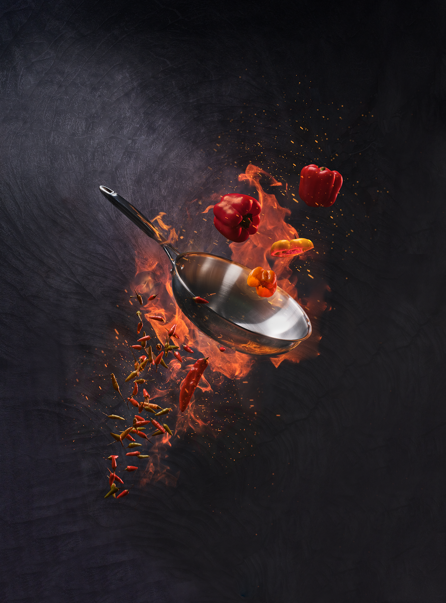 In order to reach the expectations of Cristel, each photo was sketched, each item was 3D scanned and/or custom model were created for each handle, cover, pan, from each collection. The scenes were then shot and composed in order to give each image a universe while keeping the focus on the essential: the product.